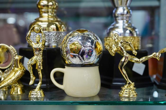 4月21日,商家陈列的足球类奖杯配件。2026年美加墨世界杯临近,义乌市场相关产品订单持续增长。